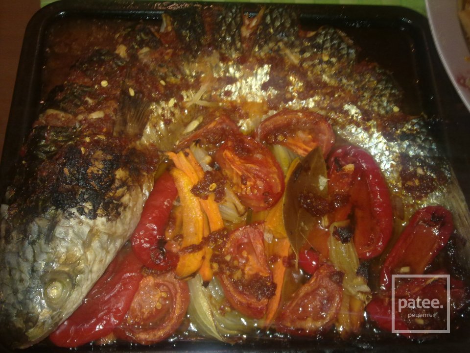 lubuu ne kostlavuu ribu pochishinuu pomituu nadrezaem na spine lojem protven apkladivaem kusochkami morkovki kusochkami balgarskova pertsa ne papalam luk razrezaem neskolka galovak toje pomidori apkladivaem palavinkami sverkhu rastitelnae masla ne jaleia i sol i v dukhovku do gatovnasti potom delaem zapravku kinza chisnok limoni sok i paprika kagda uje gatova zalivaem etim i astavlaem na neskolka sekund i vso